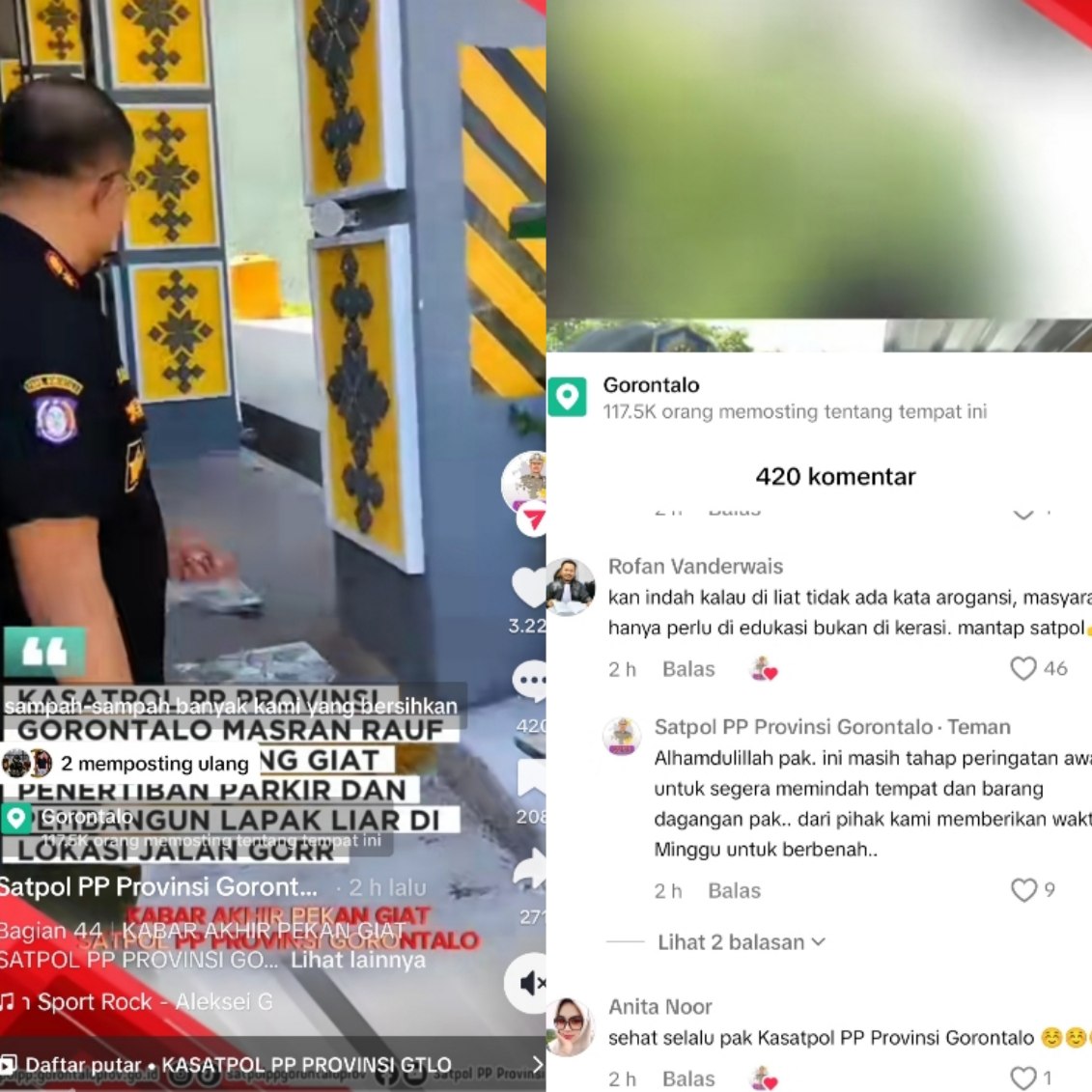 KOTA GORONTALO – Dalam sebuah video TikTok berdurasi 1 menit 34 detik yang diunggah oleh Humas Satpol PP Provinsi Gorontalo melalui akun @satpolppgorontaloprov, menampilkan aksi penertiban yang dilakukan oleh Kasatpol PP Masran Rauf di jembatan Haya-Haya mendapat respons yang baik dari masyarakat.