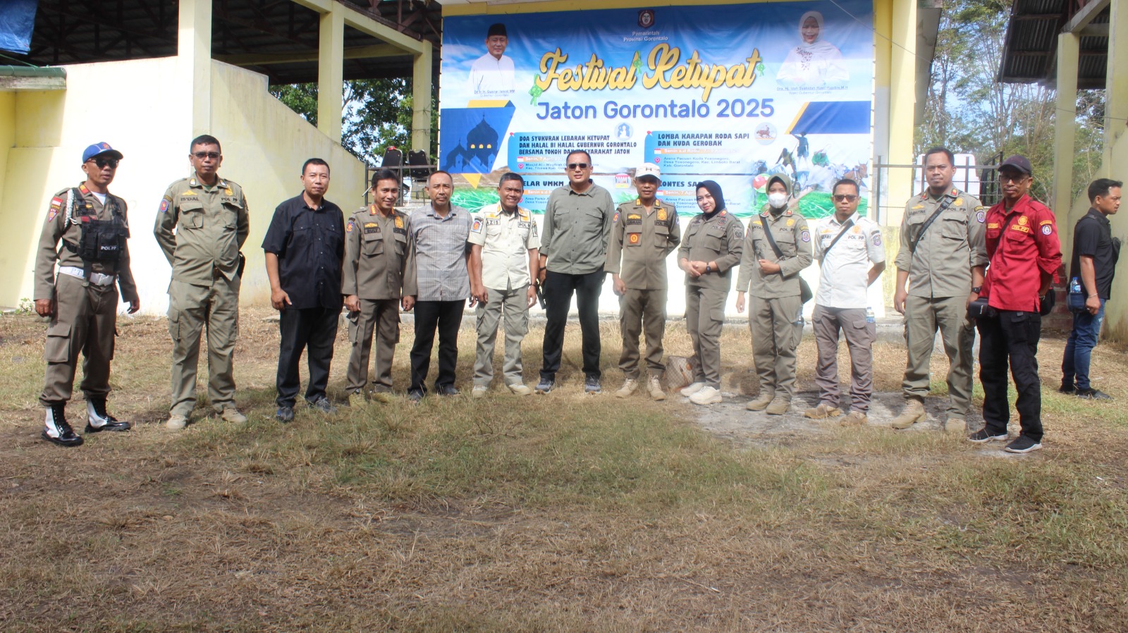 Personel Satpol PP Provinsi Gorontalo melakukan pengamanan disekitar lokasi Festival Ketupat Jaton Gorontalo 2025 yang berlokasi di Desa Yosonegoro, Kecamatan Limboto Barat Kabupaten Gorontalo.