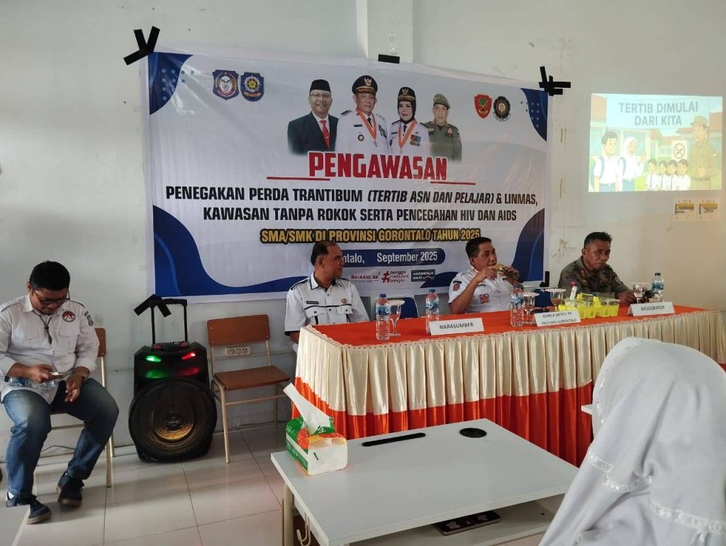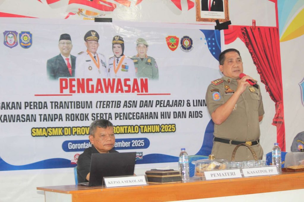 GORONTALO – Upaya menciptakan ketertiban di kalangan pelajar terus digaungkan oleh Satuan Polisi Pamong Praja (Satpol PP) Provinsi Gorontalo melalui program sosialisasi yang menyasar seluruh SMA dan SMK se-Provinsi Gorontalo. Pada Rabu (3/9/2025), giliran SMK Negeri 1 Pulubala yang menjadi lokasi kegiatan Kampanye Ketertiban, Kawasan Tanpa Rokok serta Pencegahan HIV dan AIDS di SMA/SMK Provinsi […]